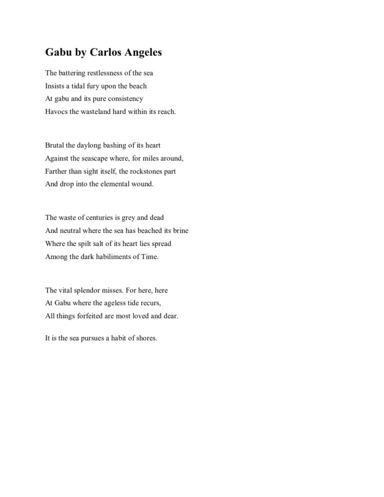 Poem Analysis Gabu Eljqk0708d41 from idoc.pub Gabuby carlos angeles the battering restlessness of the sea insists a tidal fury upon the beach at gabu, and its pure consistency havocs the wasteland hard within its reach. Gabuby carlos angeles the battering restlessness of the sea insists a tidal fury upon the beach at gabu and its pure consistency havocs the wasteland hard within its reach. Interpretation of gabu by carlos angeles? The theme of this work is the underlying restlessness of life itself and the search of the soul to find a type of spiritual permanence within its turmoil. Gabu by carlos angeles essay sample. Angeles was born in tacloban city. Brutal the daylong bashing of its heart against the seascape where, for miles around, farther than sight itself. The theme of this work is the underlying restlessness of life itself and the search of the soul to find a type of spiritual permanence within its turmoil.